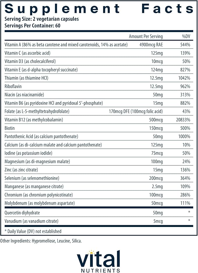 • Full-Spectrum Methylated Multivitamin for Men and Women: Vital Nutrients Multi-Nutrients 5 is a high-potency multivitamin, mineral, and antioxidant formula offering more than 20 nutrients, including B6, B12, and biotin, along with calcium, magnesium, and other essential minerals Its premium ingredients, such as Metafolin L-5-MTHF, methylcobalamin B12, and vitamin D3, ensure optimal absorption and physiological activity