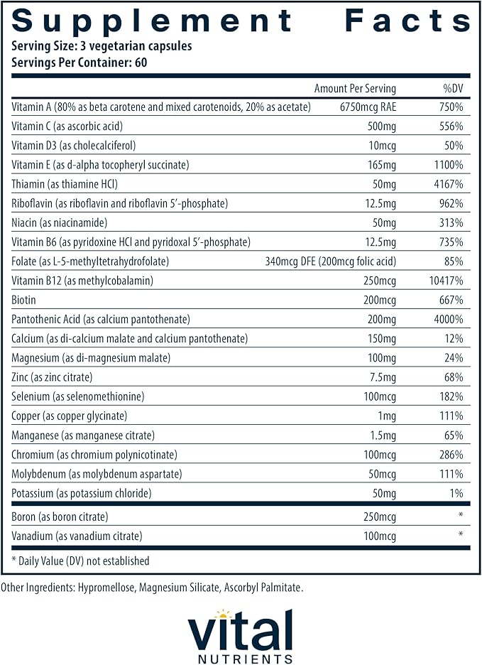 • Full-Spectrum Methylated Multivitamin for Men and Women: Vital Nutrients Multi-Nutrients (no iron or iodine) is a high-potency multivitamin, mineral, and antioxidant formula This gentle multivitamin for daily wellness is made using premium ingredients ensure optimal absorption and physiological activity, such as Metafolin L-5-MTHF, methylcobalamin B12, and vitamin D3*