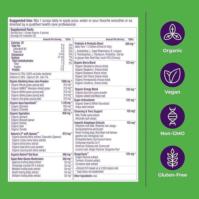 • Easy Prep: Mix 1 scoop in water or smoothies for power-packed nutrition; Non-GMO, gluten-free with no fillers or binders; Made with pure & wildcrafted organic ingredients