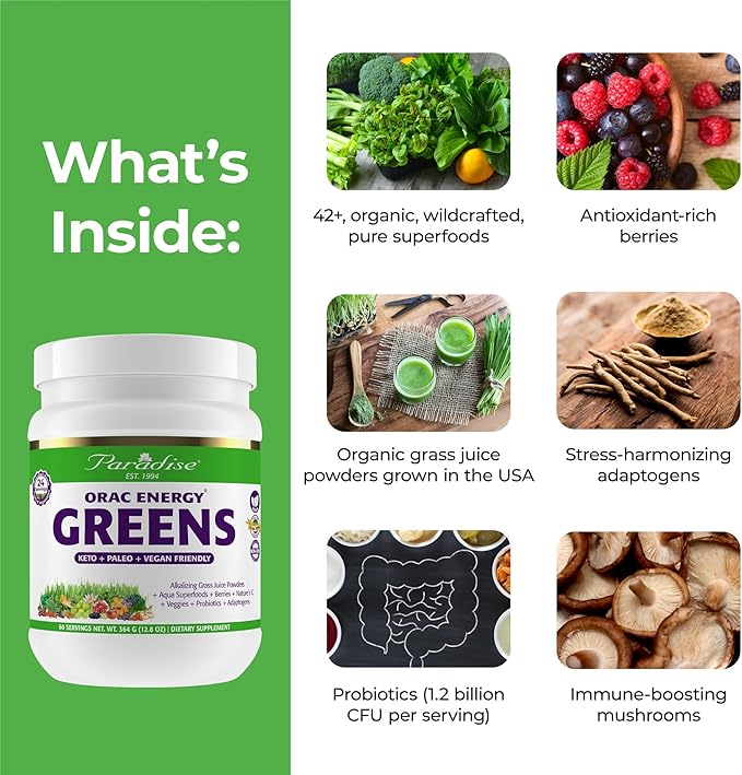 Paradise, ORAC Energy Greens Powder Extract, Super Antioxidants, Probiotics for Gut Health & Digestion, Vitamin C for Immunity, with Spirulina & Chlorella, Non-GMO, Gluten Free, 60 Servings