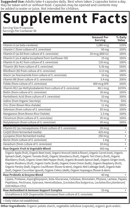 • SAY YES TO CLEAN SUPPLEMENTS: Our Whole Food Multivitamin is Third-Party Certified Non-GMO, Gluten Free & Kosher; It's also RAW—meaning no high heat, synthetic binders, fillers, artificial flavors, sweeteners, colors or additives commonly used in tablets