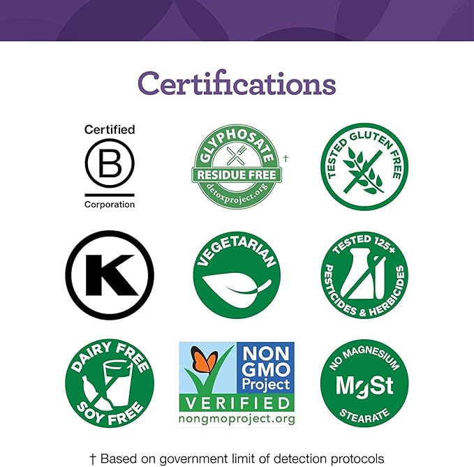 • Put To The Test: Non-GMO; Certified B Corp; Certified Kosher; Tested for over 125 chemical substances; Free of gluten, dairy and soy