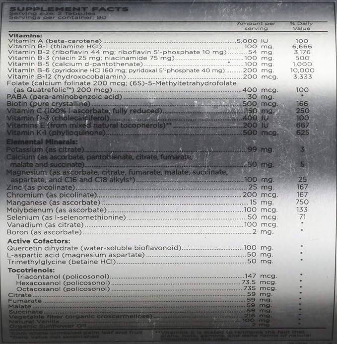 • Vitamin E(d alpha tocopherol succinate + beta, gamma & delta tocopherols) 200 i.u. Vitamin K (as phylloquinone) 500 mcg Thiamin (as thiamin hydrochloride) 100 mg
