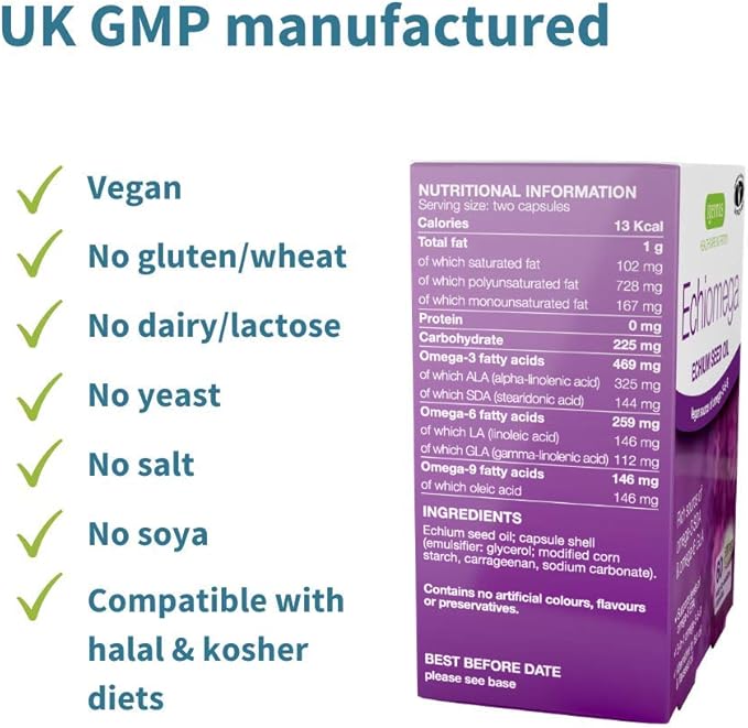 • COMPLETE VEGAN SOURCE OMEGA 369: sourced from the seed of the echium plant, Echiomega provides triple omega 369 and supports an ideal ratio of 2:1 omega-3 to omega-6 from a plant-based source