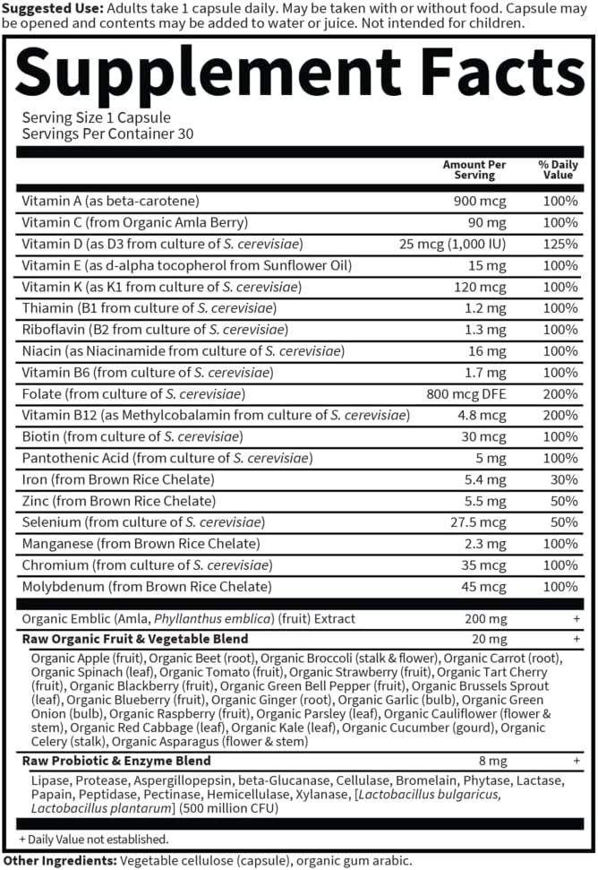 • MULTIVITAMIN WITH PROBIOTICS & WHOLE FOODS: One a day women's vitamins support energy, metabolism as well as radiant skin and nails; 24 powdered organically grown raw fruits and vegetables add supporting antioxidants, vitamins & nutrient cofactors