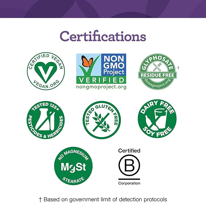 • Put To The Test: Non-GMO; Certified B Corp; Certified Kosher; Tested for over 125 chemical substances; Free of gluten, dairy and soy