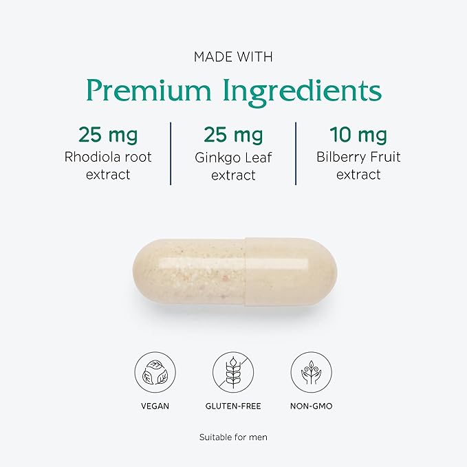 • Botanical support from: Rhodiola, Ginkgo and Bilberry fruit. Additional antioxidant support with: CoQ10 and Lutein