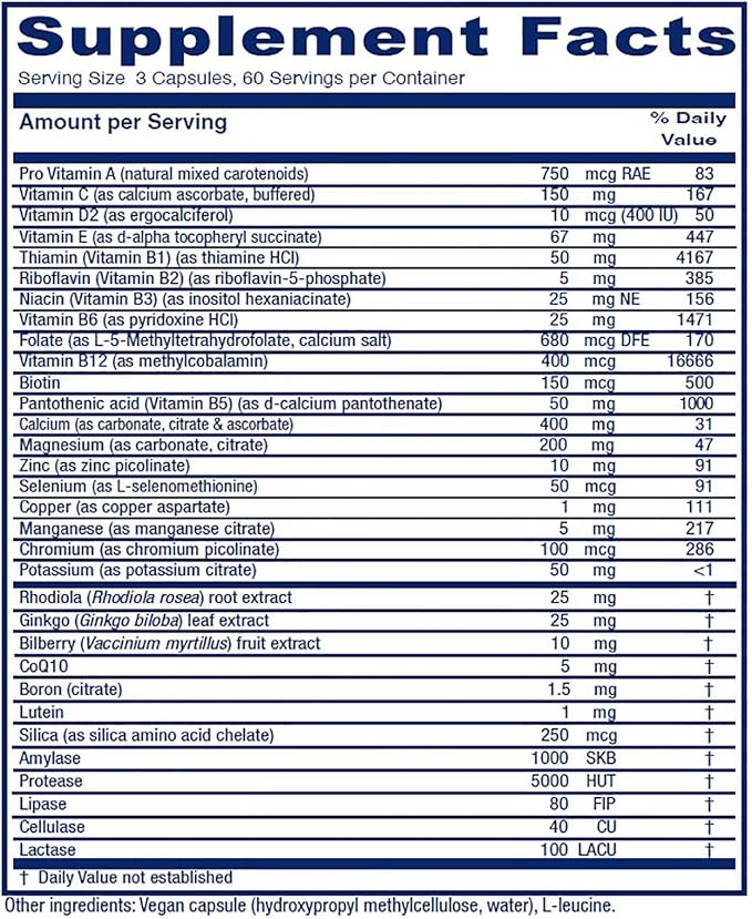 • This complete and thoughtful multiple vitamin/mineral complex addresses the common changes seen in the aging population, such as changes in calcium needs, cognition support, and digestion support. Features premium forms of nutrients and digestive enzymes promoting maximum absorption