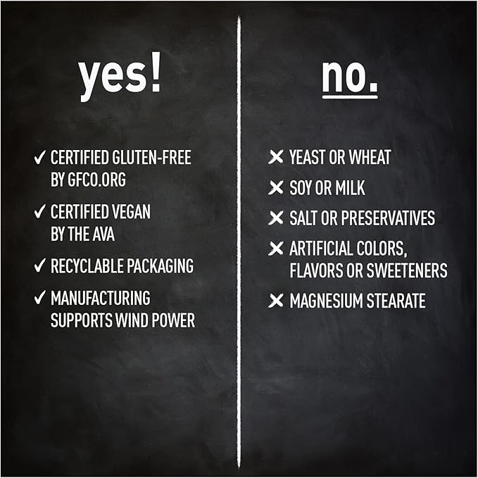 • CONTAINS ABSOLUTELY NO: Yeast - Wheat - Soy - Milk - Salt - Preservatives - Artificial Colors - Artificial Flavors - Artificial Sweeteners