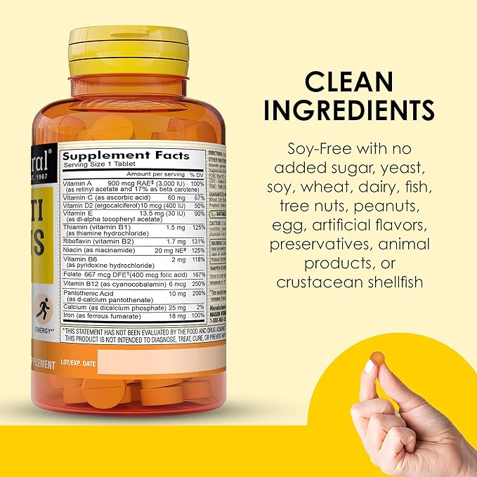MASON NATURAL Mini Multi Vitamins with Iron, Vitamins A, C, D, E, B1, B2, B3, B6, B12, Folate and Calcium for Overall Health, 1 Year Supply