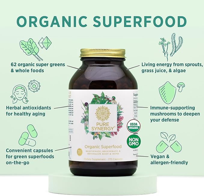 PURE SYNERGY Superfood Capsules | Organic Superfood & Greens Supplement | Whole Food Capsules with Super Greens, Spirulina, & Mushrooms | for Energy, Healthy Aging & Immune Health (270 Capsules)