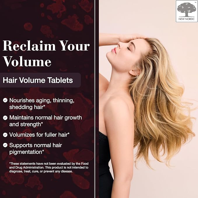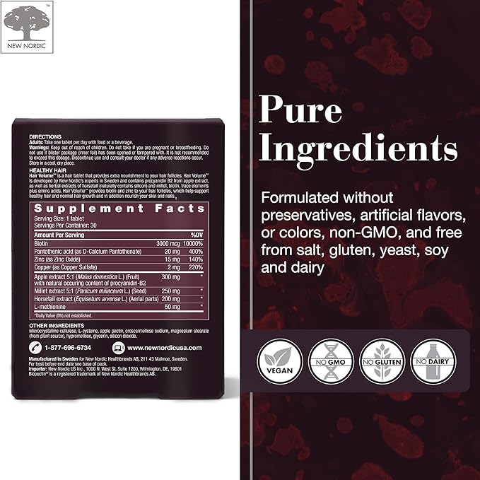 New Nordic Hair Volume Tablets, 3000 mcg Biotin & Biopectin Apple Extract, Hair Vitamins to Support Natural Hair Growth for Thicker, Fuller Hair, for Men and Women, 30 Count (Pack of 1)