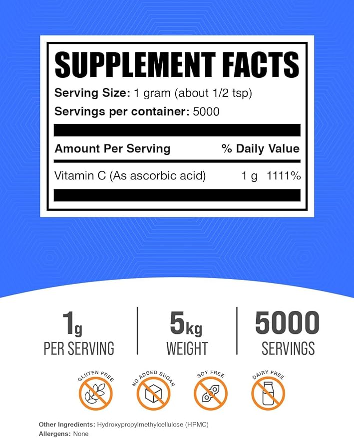 BulkSupplements.com Ascorbic Acid Powder - Vitamin C Supplement, Ascorbic Acid Food Grade - Powdered Vitamin C, Immune Support - Gluten Free, 1g per Serving, 5kg (11 lbs) (Pack of 5)