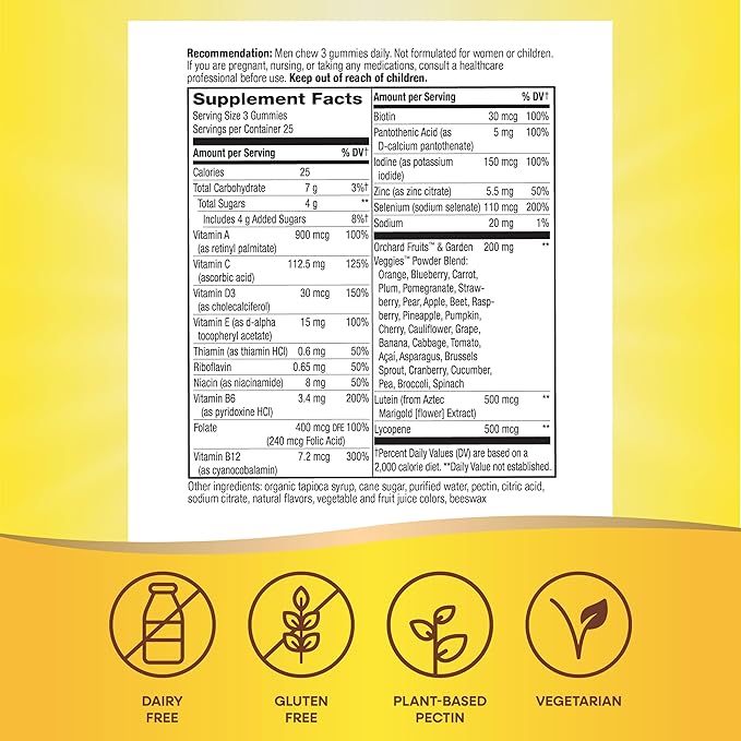 • Formulated with 15 vitamins and minerals for men’s wellness, including vitamin A, vitamin C, vitamin D3, and selenium. Full B-vitamin complex helps convert food to fuel.*
