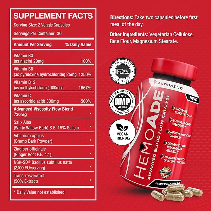 HemoAde Advanced Blood Flow Catalyst, Muscle Cramp Defense, Increase VO2, Endurance Supplement, Athletic Performance Supplements, Running Supplement, Mountain Bike Supplement, 60 Capsules