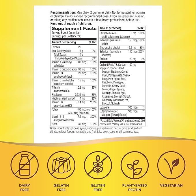 • Formulated with 15 vitamins and minerals for men’s wellness, including vitamin A, vitamin C, vitamin D3, vitamin E, vitamin B6 and vitamin B12, calcium, biotin, and zinc.* Full B-vitamin complex helps convert food to fuel.*