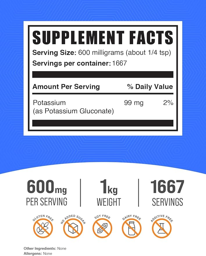• ✔️ Get the Potassium You Need: Potassium is an important mineral that our bodies need for a variety of reasons. And, our potassium gluconate powder, or potassium powder and potassium supplement. Plus our Potassium Gluconate, a potassium electrolyte powder, with 84mg of potassium, in your diet today!