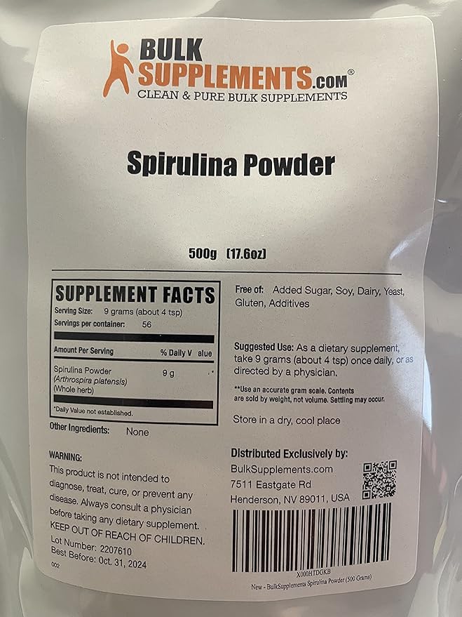 BulkSupplements.com Organic Spirulina Powder - Superfood Powder, Green Spirulina Powder, Spirulina Organic - Vegan-Friendly, 3000mg per Serving, 500g (1.1 lbs) (Pack of 1)