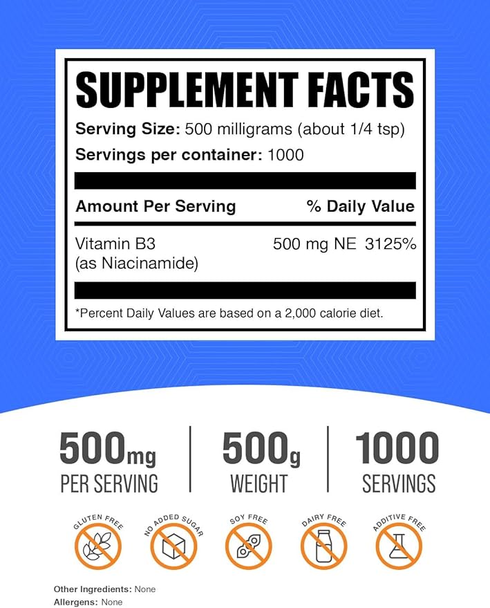 BulkSupplements.com Niacinamide Powder - Niacinamide Supplement, Vitamin B3 Supplement, Niacinamide 500mg - B3 Vitamins for Skin Health, Pure & Gluten Free - 500mg per Serving, 500g (1.1 lbs)