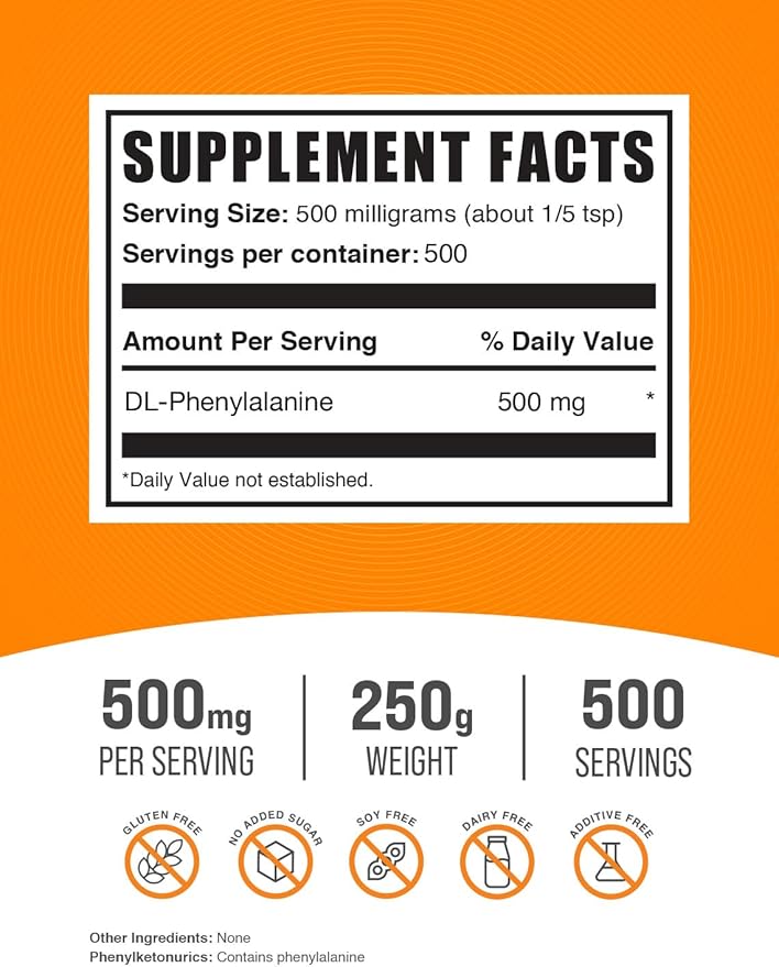 BulkSupplements.com DL-Phenylalanine Powder - DLPA Powder, DL-Phenylalanine 500mg - DLPA Supplements, Amino Acid - Gluten Free, 500mg per Serving, 250g (8.8 oz) (Pack of 1)