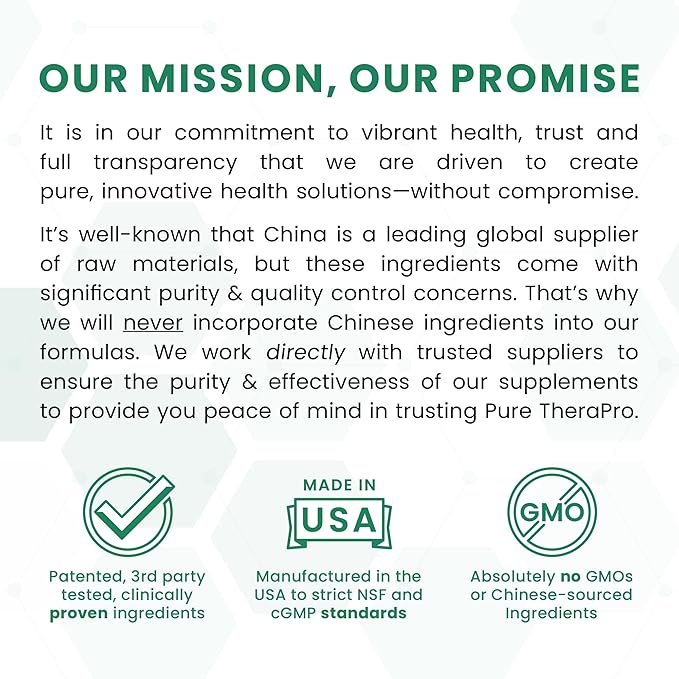 • π€ππŽπ”π“ 𝐔𝐒: Pure TheraPro Rx was founded in Denver Colorado to formulate and manufacture the highest quality supplements available on the market today. Purity is our priority, which is why we insist on using patented, clinically studied ingredients, and never utilizing fillers, flow agents, excipients, or ingredients sourced from China. We also never use dairy, gluten, corn, soy, or other common allergens in any of our class-leading, practitioner-recommended formulas.