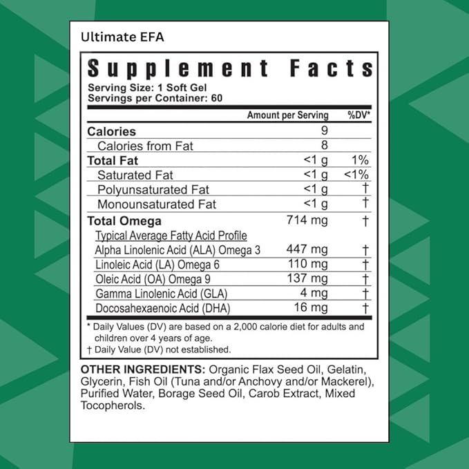 • Ultimate EFA 60 Soft Gels is a proprietary blend of essential fatty acids formulated to support the body in many ways. EFAs have been shown to support healthy coronary function. With today's active lifestyles and less than adequate eating habits, getting enough essential fatty acids is more important than ever. Consumption of Omega-3 fatty acids may reduce the risk of Coronary Heart Disease.