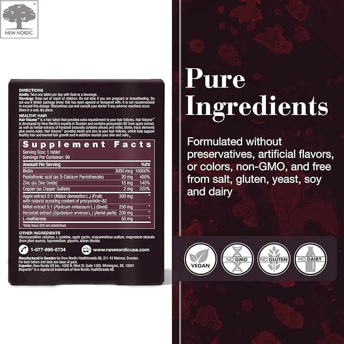 NEW NORDIC Hair Volume Tablets, 3000 mcg Biotin & Biopectin Apple Extract, Hair Vitamins to Support Natural Hair Growth for Thicker, Fuller Hair, for Men and Women, 90 Count (Pack of 1)