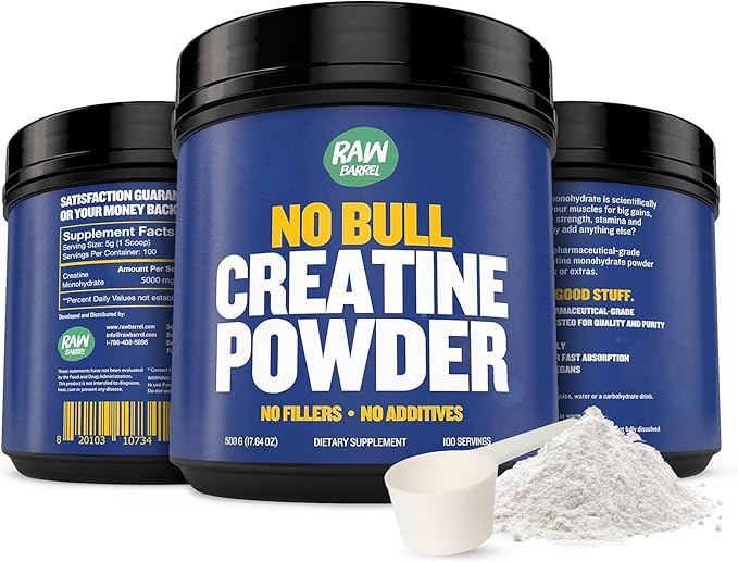 • Pure Power, No Additives - Elevate your workouts with Raw Barrel's "No Bull" Creatine Powder. Our monohydrate creatine is pure, clean, and rigorously laboratory tested. You can trust this non-GMO, keto, sugar-free, gluten-free, soy-free, and caffeine-free monohydrate creatine supplement for a clean and effective boost.