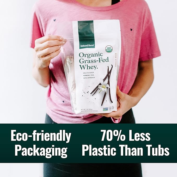 Natural Force Grass Fed Organic Whey Protein Powder – Non GMO Verified, Humane Certified & Lab Tested for Toxins – Real Vanilla Flavor – Keto Friendly, Low Carb, and Kosher - 16 Ounce A2 Protein