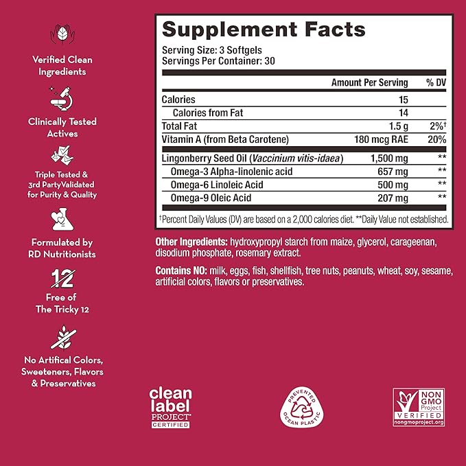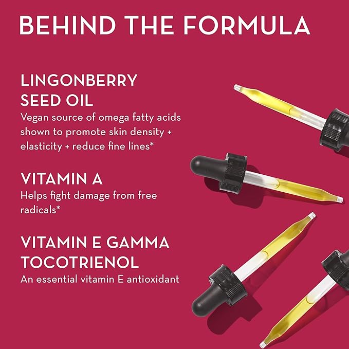 • Lingonberry seed oil contains a healthy ratio of omegas 3, 6, 9 to support healthy skin structure