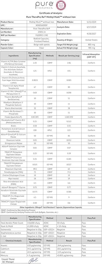 • 𝐍𝐎 π€π‘π“πˆπ…πˆπ‚πˆπ€π‹ πˆππ†π‘π„πƒπˆπ„ππ“π’: Pure TheraPro Rx Methyl Multi without Iron contain no fillers such as rice flour, cornstarch, or wood pulp fibers. Our manufacturing facility adheres to strict NSF/cGMP guidelines. Consumer safety and satisfaction are our highest priority, which is why our products undergo rigorous third-party testing and screening to ensure product purity and potency.