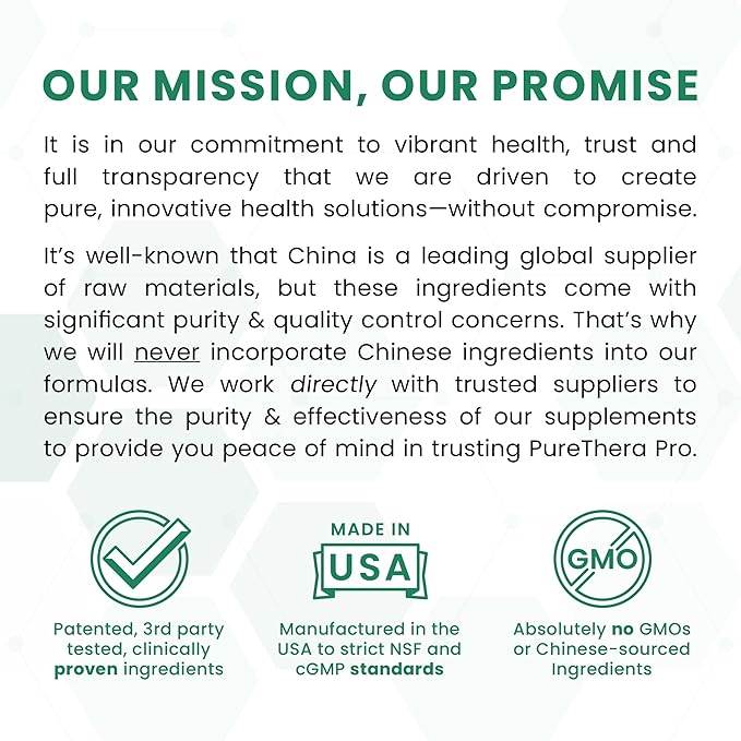 • π€ππŽπ”π“ 𝐔𝐒: Pure TheraPro Rx was founded in Denver Colorado to formulate and manufacture the highest quality supplements available on the market today. Purity is our priority, which is why we insist on using patented, clinically studied ingredients, and never utilizing fillers, flow agents, excipients, or ingredients sourced from China. We also never use dairy, gluten, corn, soy, or other common allergens in any of our class-leading, practitioner-recommended formulas.