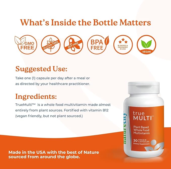 • NON-SYNTHETIC SUPPLEMENT – Unlike multivitamins made with synthetic vitamins produced in a lab, the plants used to make TrueMulti contain nutritional “cofactors” like those found in food. These cofactors boost vitamin absorption and aid in vitamin utilization in the body