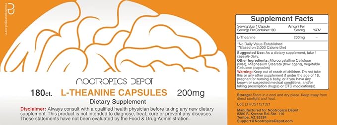 Nootropics Depot L-Theanine Capsules 200mg (180 Count) | Promotes Relaxation | Supports Healthy Stress Levels + Sleep Cycles | Promotes Cognitive Function + Focus | Amino Acid Supplement