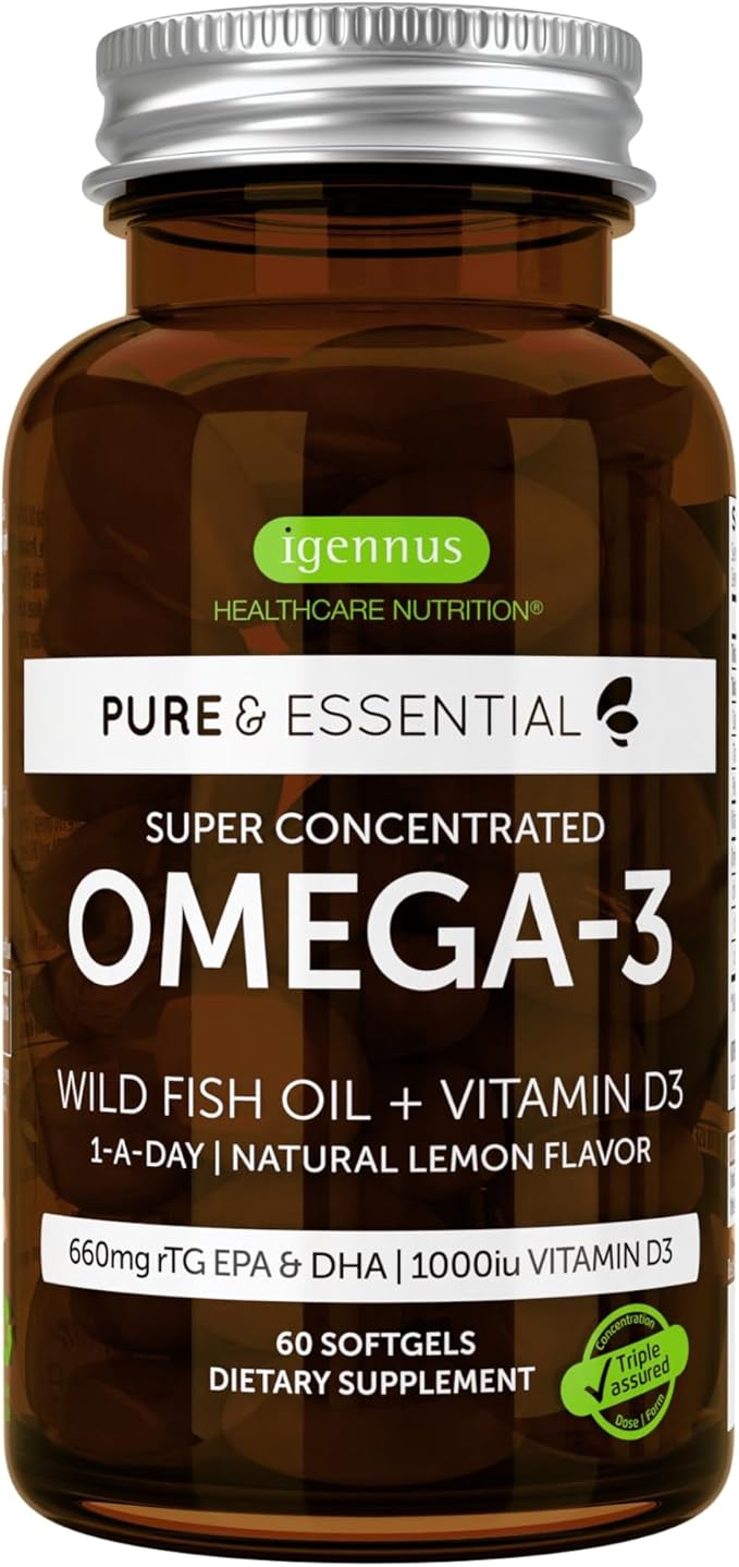 Advanced Omega-3 Wild Fish Oil & Vitamin D3 1000iu, 1-a-Day, Triglyceride Form EPA & DHA Fatty Acids, Fast-Acting rTG, Ultra Pure & Non-GMO, 60 Softgels, by Igennus
