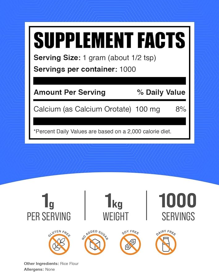• Designed for Optimal Health: Elevate your daily wellness routine with our Calcium Orotate powder, in Calcium Orotate 1000mg. These are not just supplements; Calcium Orotate supplement is a daily investment in your wellbeing, meticulously formulated to ensure your body receives the perfect balance of essential minerals for optimal health.