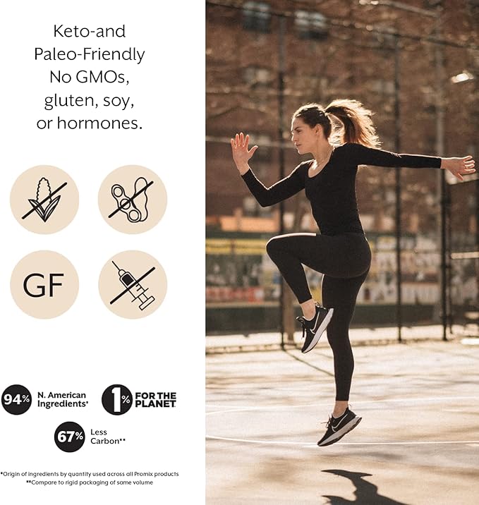 • Seriously Clean: Collagen Peptides are keto-friendly. All Promix products are free of gluten, soy, GMOs, hormones, antibiotics, refined sugar, artificial sweeteners, xanthan gum, fillers, and bleach. 94% of ingredients sourced from North America. Partner of 1% for the Planet. Produced in facilities using GMP (Good Manufacturing Practice) standards.