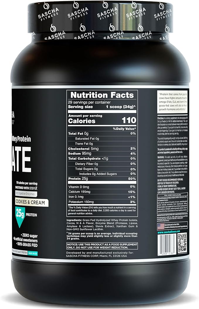 SASCHA FITNESS Hydrolyzed Whey Protein Isolate,100% Grass-Fed (2 Pounds, Cookies & Cream)