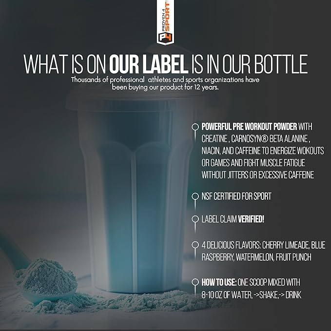 • NSF Certified Ingredients: The Proven4 Sport pre workout with creatine is NSF certified for sport with thorough third party testing, enjoying a clean and transparent ingredient list containing a powerful blend of Creatine, Beta Alanine, Caffeine, Taurine, Niacin. Our P4 sport pre workout powder are developed having in mind Pro Athletes and are considered safe for use by all professional sports organizations, including the NHL, Major League Baseball, NFL, PGA using label claim verified ingredients and ensuring highest quality.