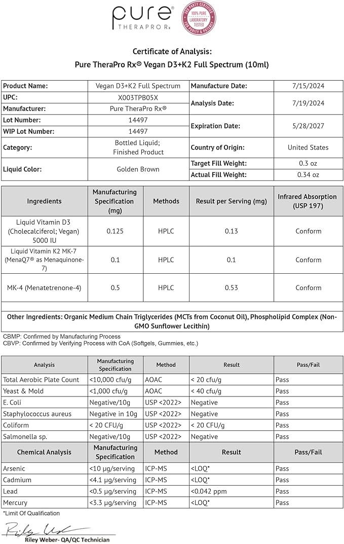 • ππ”π€π‹πˆπ“π˜ 𝐓𝐄𝐒𝐓𝐄𝐃: All our supplements are lab-tested for quality and purity. We do not use fillers, excipients, or flow agents in our supplements. Our Pure TheraPro Rx Vitamin D3 + K2 has no gluten, wheat, yeast, animal or dairy products, artificial preservatives, sweeteners, or colors.