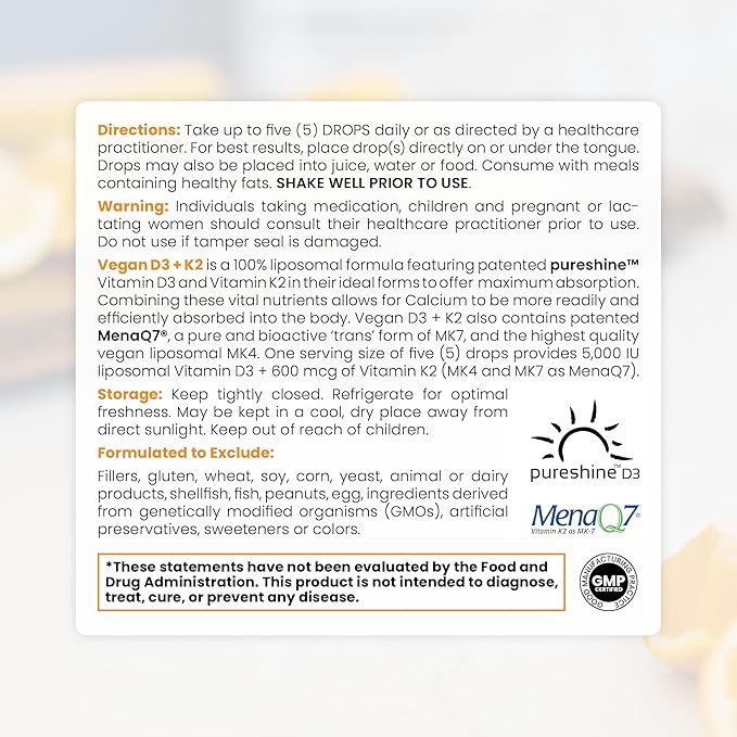 • 𝐄𝐗𝐂𝐄𝐋𝐋𝐄𝐍𝐓 𝐕𝐀𝐋𝐔𝐄: Our vitamin supplement contains essential forms of liposomal Vitamin K2, including patented MenaQ7, a pure and bioactive β€˜trans’ form of MK7, and the highest quality vegan liposomal MK4. One serving size of five (5) drops will provide you 5,000 IU liposomal Vitamin D3 + 600 mcg of Vitamin K2 (MK4 and MK7 as MenaQ7).