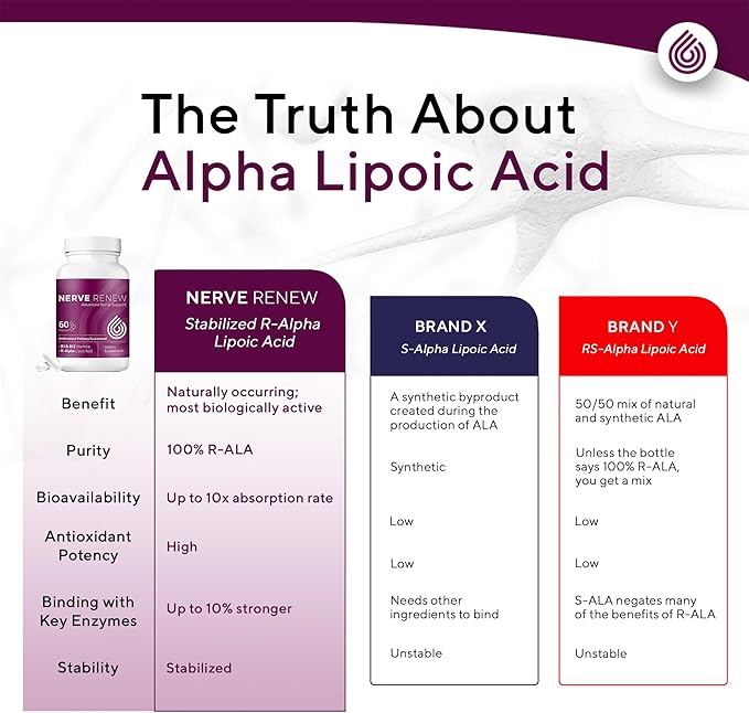 • 10% Stronger R-Alpha-Lipoic Acid: Our R alpha lipoic acid 300mg capsules are powered by the most stabilized naturally occurring form of this standout nerve antioxidant. Thus, more easily absorbed and utilized R ALA by the body than most forms found in other nerve health supplements. We optimized Nerve Renew for maximum results because our nerves deserve the best.
