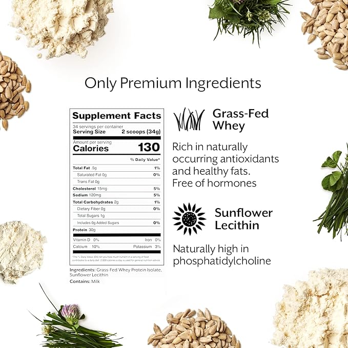 • Whole Food-Based Ingredients: Made of grass-fed whey (rich in naturally occurring antioxidants and healthy fats), sunflower lecithin (naturally high in phosphatidylcholine), vanilla extractives, and coconut sugar (lower glycemic index, minimally processed natural sweetener). That’s it.
