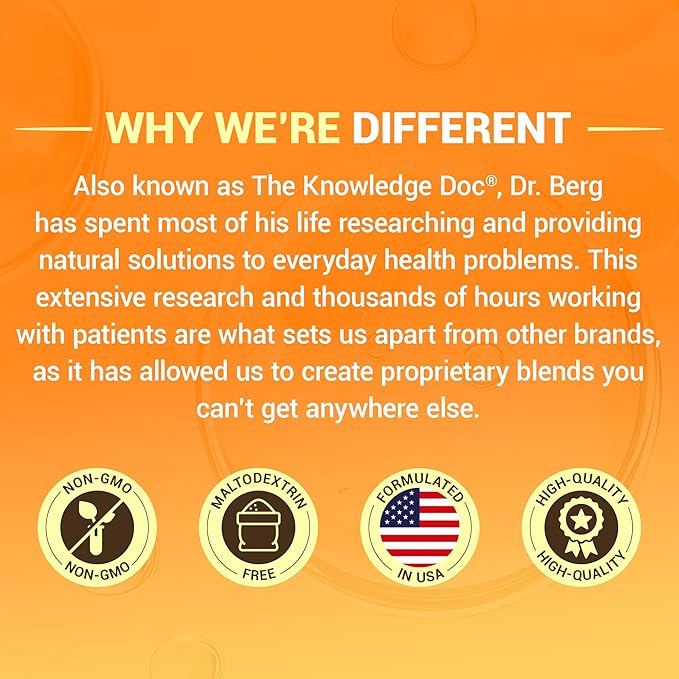 • ๐—ช๐—›๐—ฌ ๐—ช๐—˜โ€™๐—ฅ๐—˜ ๐——๐—œ๐—™๐—™๐—˜๐—ฅ๐—˜๐—ก๐—ง - Also known as The Knowledge Doc, Dr. Berg has spent most of his life researching and providing natural solutions to everyday health problems. This extensive research and thousands of hours working with patients are what sets us apart from other brands, as it has allowed us to create proprietary blends you canโ€™t get anywhere else.