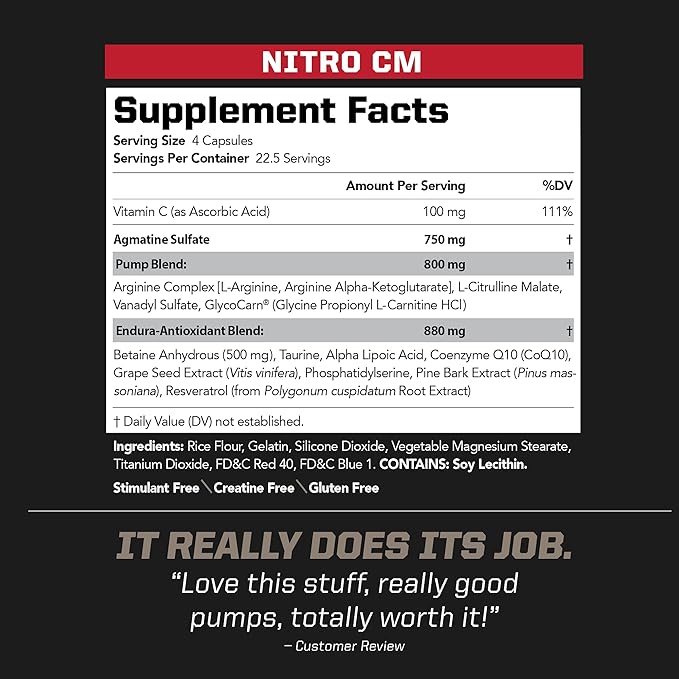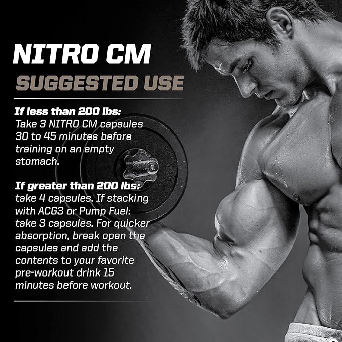 • More Intense Muscle Pumps: Nitro CM features Agmatine. Agmatine gets absorbed into your system quicker and more effectively than Arginine, thus allowing you to feel the effects more readily than before. It accomplishes this by inhibiting the enzyme nitric oxide synthase (NOS). Agmatine supports enhanced athletic performance; increases muscle size, fullness, and density; and produces stronger muscle pumps.
