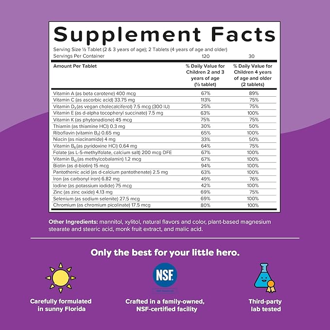 • How to take: Children 2-3 years old take 1/2 tablet daily; children ages 4 and older take 2 tablets daily; our vitamins melt in your kids’ mouth or can also be dissolved in water, juice or even smoothies. Kids can chew them or let them melt without worrying of anything getting left behind on their teeth.