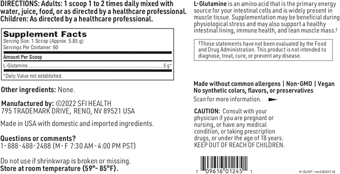 • Supplies 5 g (5000 mg) of free form L-glutamine per scoop.
