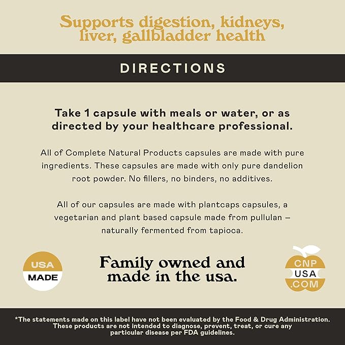 • A GREAT CLEANSE: If You're Looking To Use Dandelion Root As A Kidney Cleanse, Liver Cleanse Or Whole Body Cleanse, To Soothe Upset Stomach Or As An Anti-Inflammatory Support, Complete Natural Products Pure Dandelion Root Capsules Is The Product To Choose! It's 100% Natural With No Unnecessary Additives, Fillers Or Flavors.
