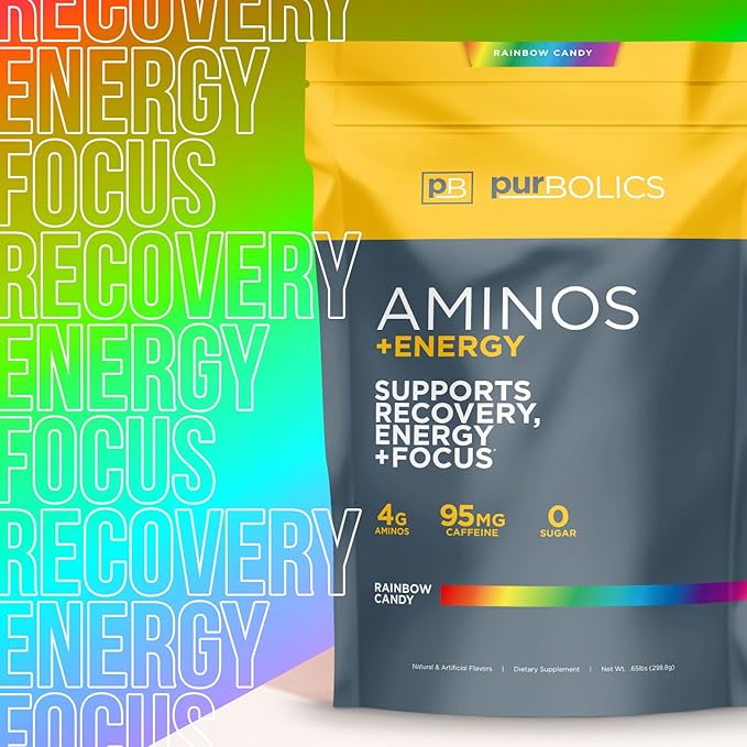 Aminos + Energy | Supports Recovery, Energy & Focus | 95mg of Caffeine, 0 Sugar & 60 Servings (Rainbow Candy)
