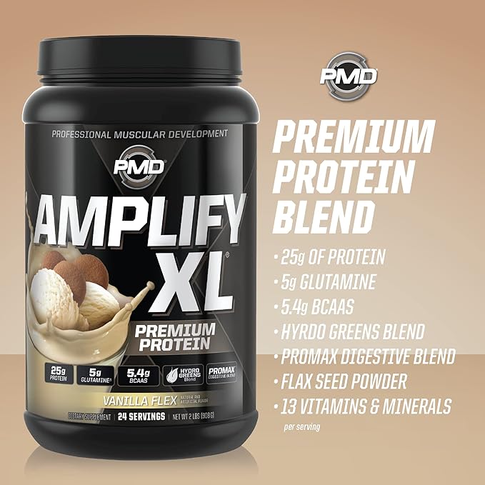 PMD Sports Amplify XL Premium Whey Protein Supplement Hydro Greens Blend - Glutamine and Whey Protein Matrix with Superfood for Muscle, Strength and Recovery - Vanilla Flex (24 Servings)